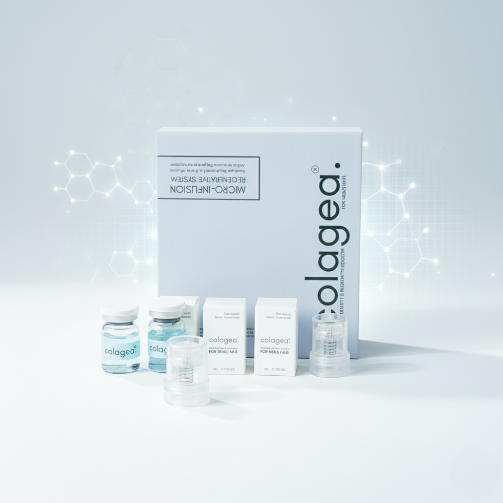 Colagea® was born from a collaboration between a biomedical engineer and a dermatology expert.Facing hair loss, they designed a solution combining technological precision and clinical efficacy: Micro-Infuse®, a patented micro-needle system delivering active ingredients directly into the follicles.A scientific approach. Visible results.Colagea®—where technology meets trust.